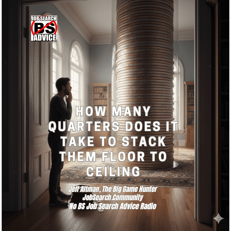 Here, Jeff Altman, The Big Game Hunter answers this hedge fund brain teaser question, “How many quarters would it take to make a stack from floor to ceiling?”